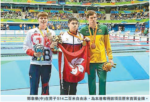 【香港商報網訊】記者馮仁樂報道:里約2016年殘疾人奧運會昨日踏入第6天,港隊在游泳及乒乓項目取得1金1銅,暫列獎牌榜第43位。其中奪得冠軍的泳將鄧韋樂在200米自由泳打破個人及殘奧運紀錄。乒乓球代表吳玫薈就在乒乓單打獲得港隊首面獎牌。行政長官梁振英昨日發表聲明,恭賀港隊勇奪獎牌。