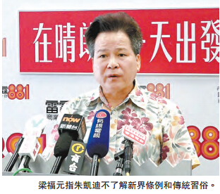 【香港商报网讯】记者戴合声报道:十八乡乡事委员会主席梁福元昨日反击候任立法会议员朱凯迪近日的言论,指对方长期对新界问题提出很多意见,但对新界的条例和传统习俗可能不太了解。梁福元指出,新界有新界的条例和土地政策,很多时与市区不同。他又不认同对方提出所谓「官商乡黑勾结」的指控,认为只是「官商乡合作」。