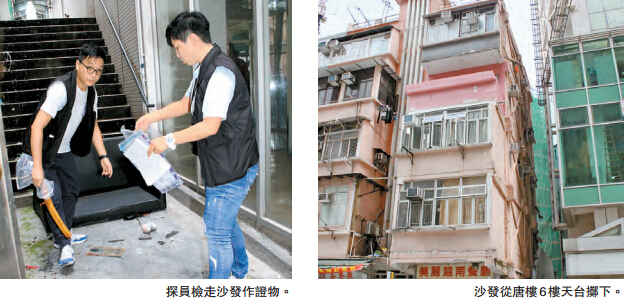 掷沙发事件在前日上午9时许发生,有住客通知保安员,指上址唐楼与毗邻新大厦之间的後巷,有一张沙发出现,沙发木脚尽断。保安员翻查闭路电视片段,发现在3日前有人从高处将该张双人座位沙发掷到地面,保安员遂报警求助,警员到场登楼调查,但未有发现。
