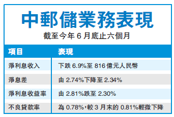 截至今年6月底,中郵儲凈利息收入下跌6.9%至816億元人民幣,凈息差由2.74%下降至2.34%,凈利息收益率由2.81%跌至2.3%,不良貸款率為0.78%,較3月末的0.81%輕微下降。