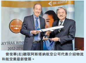 财政司司长曾俊华率领商贸代表团於昨午抵达阿拉木图展开访问行程,他们抵达後随即与阿斯塔纳航空公司总裁兼首席执行官Peter Foster会面,了解哈萨克斯坦物流业和航空业的最新发展。阿斯塔纳航空公司拥有一支由30架飞机组成的机队,运营60多条国内和国际航线。