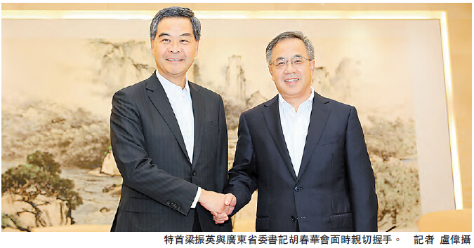 昨日,特首梁振英率團赴廣州出席粵港聯席會議期間,與中共中央政治局委員、廣東省委書記胡春華會面。胡春華認為,粵港在科技創新領域的合作切中廣東經濟發展的核心內容;廣東省今年經濟取得更好的表現,就在於科技創新的優勢。