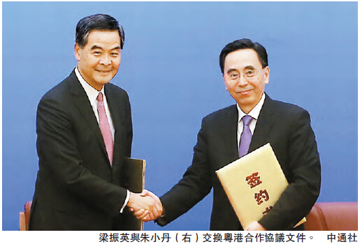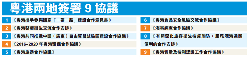 梁振英及朱小丹代表兩地政府簽署《粵港攜手參與國家「一帶一路」建設合作意見書》,為粵港合作提供了更廣闊空間。除此之外,兩地政府部門還簽署了另外8項協議文件(見表)。