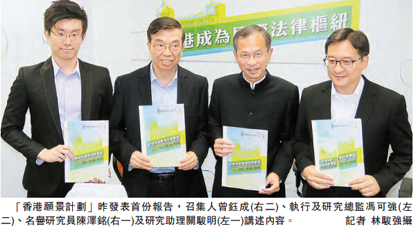 由立法會主席曾鈺成擔任召集人的智庫「香港願景計劃」,昨日發表首份報告,題為《香港成為國際法律樞紐—把握「一帶一路」的機遇》。曾鈺成表示,國家「一帶一路」發展策略,為香港帶來實際的機遇,可以為本港法律界以至是整個社會帶來實際的發展收益。他亦相信香港可以在國家的發展當中,扮演無可取代的角色,因為「一國兩制」為香港帶來獨特的條件,在「一帶一路」下可以發展成國際性爭議解決中心。