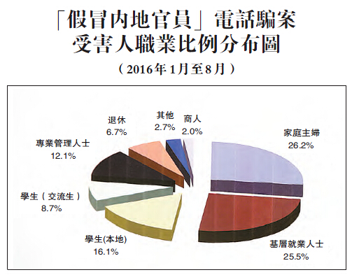 警方昨日召開記者會,總結今年首8個月的電話騙案數字,指當局共接獲559宗相關舉報,較去年同期減少逾七成,當中311宗有金錢損失,涉及款項1.2億元,其中絕大部分損失金額是與假冒內地官員騙案有關。警方又發現,電騙受害人有年輕化趨勢,大部分假冒官員騙案的受害人都是18至29歲年輕人,佔總數逾四成,當中近一成是非本地留學生。