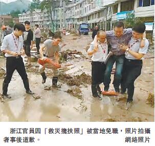值得注意的是,浙江官員因「救災攙扶照」被免職一事。浙江泰順在這次台風中受災嚴重,而16日網傳的浙江泰順縣教育局計財科科長包序威被人抬著去視察災情的照片,成為很多網友抨擊的對象。此照片的拍攝者昨日發布「特別聲明」稱外界過度解讀,并對此表示道歉。