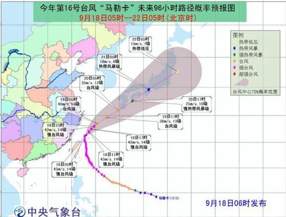今年第16号台风“马勒卡”(强台风级)的中心18日早晨5点钟位于浙江温岭东南方大约280公里的东海南部海面上,就是北纬26.4度,东经123.1度,中心附近最大风力有14级(45米/秒),中心最低气压950百帕,七级风圈半径280~320公里,十级风圈半径100公里,十二级风圈半径50公里。