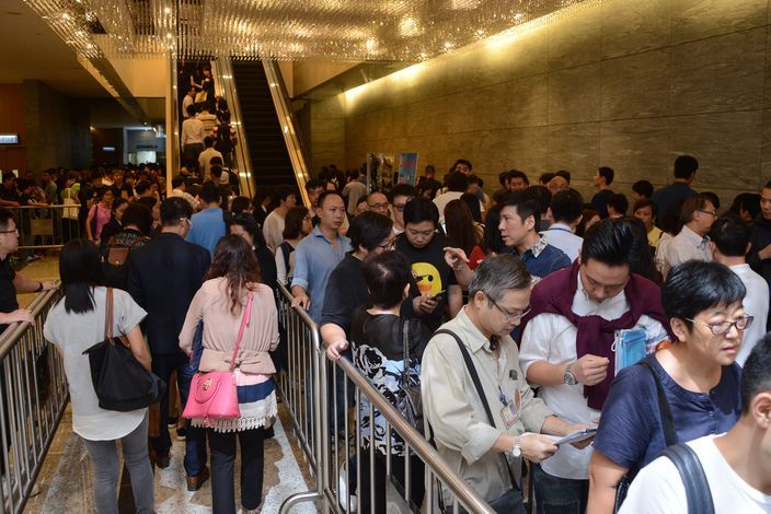 該盤於下午1時開始登記,就昨日現場所見,準買家早於半小時前到達排隊,高鋒時期人龍達數百人,人龍延伸至商廈樓下一層,有部分準買家更一家大細到場,場內人頭湧湧。