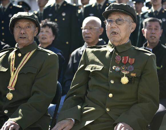 9月18日,参加仪式的两位抗战老兵在唱国歌。 新华社