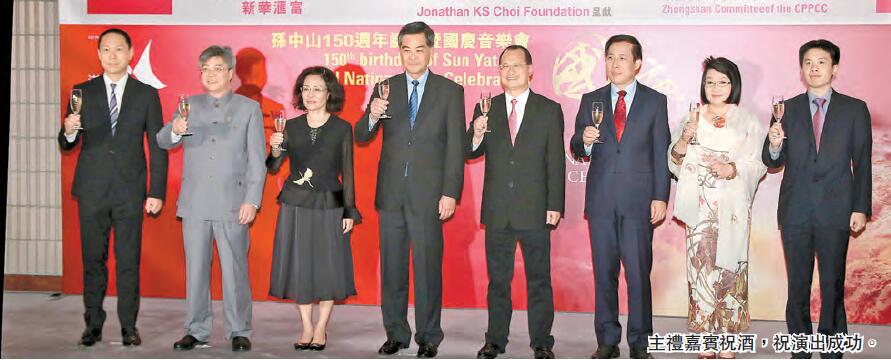 【香港商报网讯】记者霄虹报道:由蔡冠深基金会呈献的「纪念孙中山150周年诞辰暨国庆音乐会」,日前假尖沙咀文化中心隆重首演。特区行政长官梁振英、中联办副主任杨建平、外交部驻港副特派员佟晓玲、蔡冠深基金会主席蔡冠深、中山市政协主席丘树宏,以及各国驻港总领事和政商界友好出席首演酒会。音乐会吸引了约1800人入场观看。