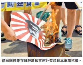 逾十名保钓行动委员会及教协成员昨中午由中环邮政总局游行至日本驻港领事馆。他们要求日本承担战争历史责任、道歉和赔偿,亦批评日本进入钓鱼岛海域。他们又提到,本月底法庭会处理「启丰二号」禁止出海的禁制令上诉申请,如果胜诉便会再到钓鱼岛。他们到达领事馆外烧毁请愿信及日本军旗。