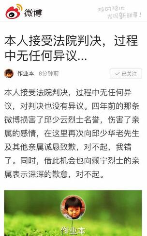 随后,孙杰通过微博表示接受判决,并向邱少华致歉。