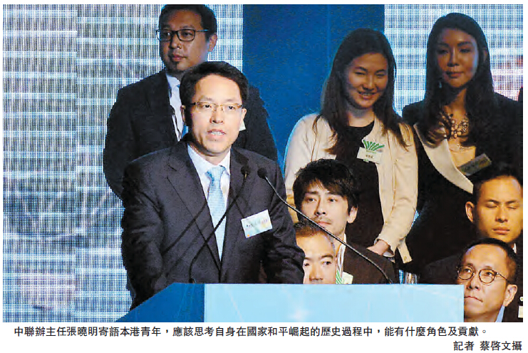【香港商報网訊】記者林駿強報道:國家昂然踏上世界舞臺,強勁發展勢頭備受全球矚目。中聯辦主任張曉明昨晚出席香港青年聯會活動時指出,今天的中國不僅已站起來,更是富起來、強起來,國家也為青年的成長、成功提供了條件。他寄語本港青年應該思考自身在國家和平崛起的歷史過程中,能有什麼角色及貢獻,相信本港青年一定會作出無愧於時代、國家及先輩的回答。出席同一場合的行政長官梁振英(CY)亦鼓勵本港青年人要多關心社會及祖國,應善用當局資源,同時好好裝備自己,把握好內地機遇。