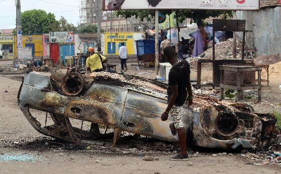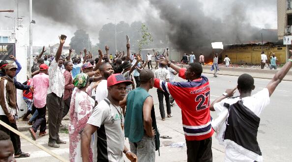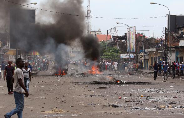 这是9月19日在刚果(金)首都金沙萨拍摄的示威冲突现场。