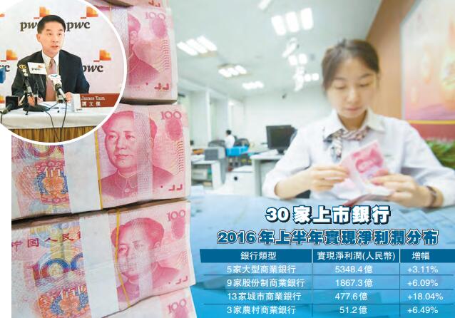 另外,由於附息資產收益率大跌,導致銀行淨利差及淨息差收窄,報告指出,30間上市銀行上半年實現淨利潤7744.52億元人民幣,按年升4.60%,當中大型商業銀行增幅僅3.11%,城商行則增長18.04%(見表)。