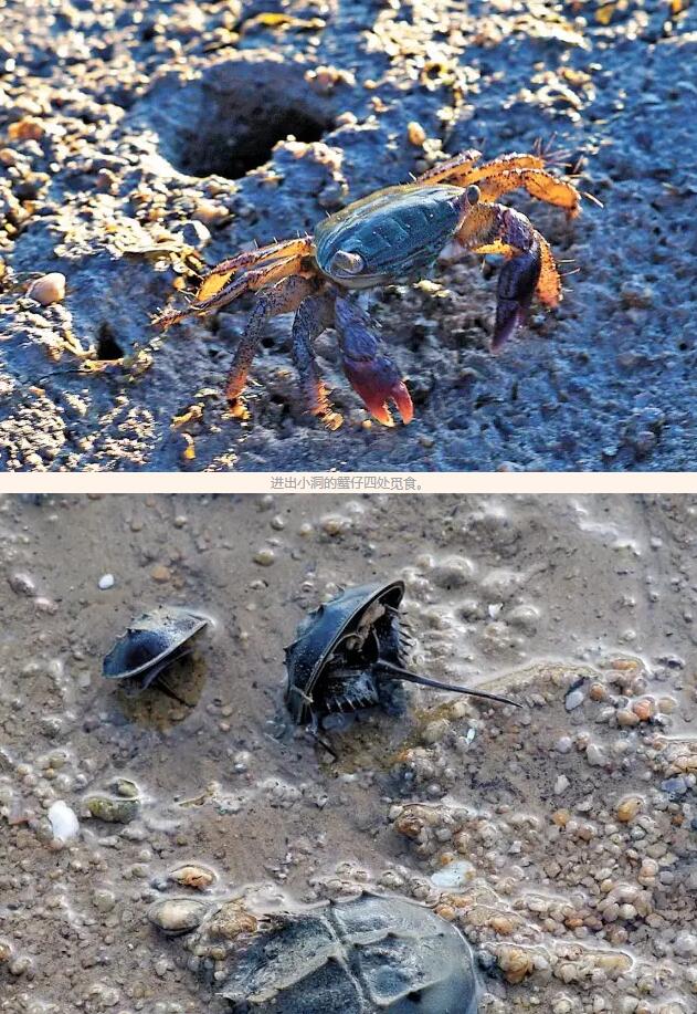除了自然景观,来这里的人们也能在泥滩中发现一些两栖生物,如马蹄蟹、蟹仔等等。蟹仔常常在一个个的小洞中进进出出,四处觅食。