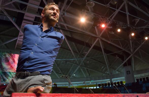 9月22日,澳大利亚着名残疾人励志演讲家尼克·武伊契奇在匈牙利首都布达佩斯演讲。