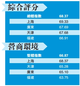 分區域來看,上海自貿區的評分最高(69.33),而福建最低(66.91),廣東(67.69)與天津(67.68)較為接近。上海財經大學上海發展研究院副院長江若塵分析稱,該結果表明上海的先試先行的效果凸顯,但她同時指出,由於各個自貿區所承擔的戰略任務的不同,隨著另外3個自貿區的發展,未來的評價可能會發生變化。