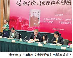 【香港商报网讯】记者冯仁乐报道:讲述香港杰出实业家、「纺织大王」唐翔千经历的《唐翔千传》,於今年6月在内地出版,上海市政协港澳台侨委员会、上海海外联谊会、上海人民出版社、上海唐君远教育基金会昨日举办座谈会,分享唐翔千对香港与中国的贡献。