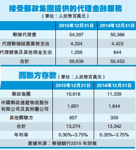 郵儲銀行2015年報顯示,郵儲銀行除使用自有營業網點開展商業銀行業務外,還委託郵政集團及各省郵政公司利用其下設的經批准取得金融許可證的網點,作為代理營業機構,代理部分商業銀行業務,主要包括:吸收本外幣儲蓄存款、從事銀行卡(借記卡)業務、受理信用卡還款業務、代理發行、兌付政府債券、提供個人存款證明服務、代理銷售基金、個人理財產品及郵儲銀行委託的其他業務。根據中銀監《中國郵政儲蓄銀行代理營業機構管理暫行辦法》的規定,郵儲銀行與郵政集團及各省郵政公司通過簽訂《代理銀行業務框架協議》及《委託代理銀行業務協議》規範各項委託代理業務,并確定代理業務收費依據。