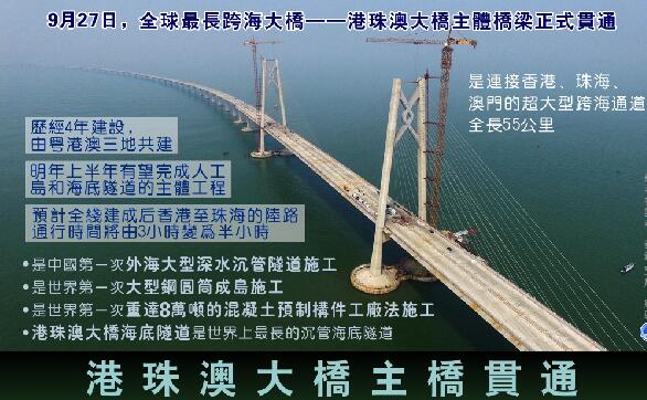 港珠澳大桥总长55公里,是连接香港、珠海和澳门的超大型跨海通道,也是迄今世界最长的跨海大桥,包括海中桥隧主体工程,以及香港、珠海、澳门三地口岸和连接线。