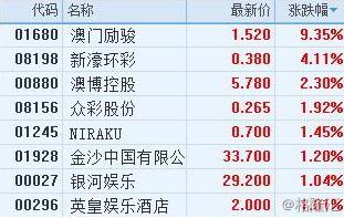 今日港股賭場博彩板塊造好,澳門勵駿飆高漲逾一成,新濠環彩漲幅亦高至8%,金沙、銀娛漲幅亦近2%,暫居藍籌股漲幅榜前列。