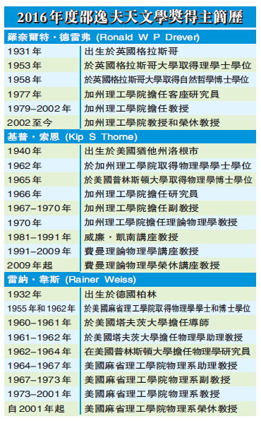 【香港商報网訊】記者馮煒強報道:2016年度邵逸夫天文學獎平均頒予羅奈爾特·德雷弗(RonaldWPDrever)、基普·索恩(KipSThorne)及雷納·韋斯(RainerWeiss),以表彰他們對「激光干涉儀重力波觀測站」(LIGO)的構思和設計。LIGO最近首次直接觀測到重力波,為天文探索開創了一個新方法。首先偵測到的非凡事例,為兩個星級質量的黑洞合併,此發現推動相對論引力的驗證進入一個嶄新的時代。