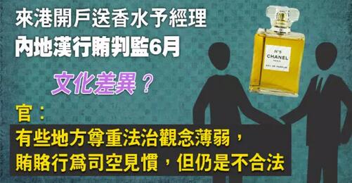 浙江一男性商人来港为其纺织公司开设汇丰银行户口,其间向该行助理经理赠送一支价值1350元的CHANEL(香奈儿)香水,希望可提交较少文件,被该职员拒绝。昨日,该内地男承认一项行贿罪,被判监6个月。裁判官指,任何损害廉洁的罪行均十分严重,绝不可轻轻带过,强调不可以文化差异之说开脱;若“文化差异”说法成立,无异是将差劣文化带来香港,冲击香港廉洁制度。
