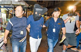 昨晚9時半,重案組探員用客貨車接載其中一名疑犯到油麻地彌敦道300號華豐大廈搜屋,他被黑布蒙頭、雙手鎖上手銬,由探員陪同上樓蒐證,逗留約10分鐘後離去。
