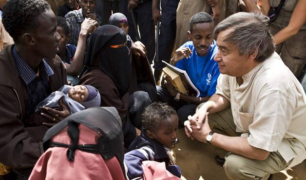 2008年6月,时任联合国难民高专古特雷斯前往肯尼亚达达布难民营看望难民。