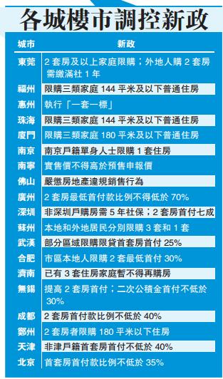【香港商报网讯】昨日楼市调控步伐依旧矫健,最近加入新政调控的城市包括广东珠海、东莞、惠州和福建福州。业内人士认为,如果没有信贷措施配合限购,很难在短期内让房价下行,未来则将有两类城市会继续出台收紧政策,分别是楼价上涨较快的二线热点城市和位於一线城市周边的城市。
