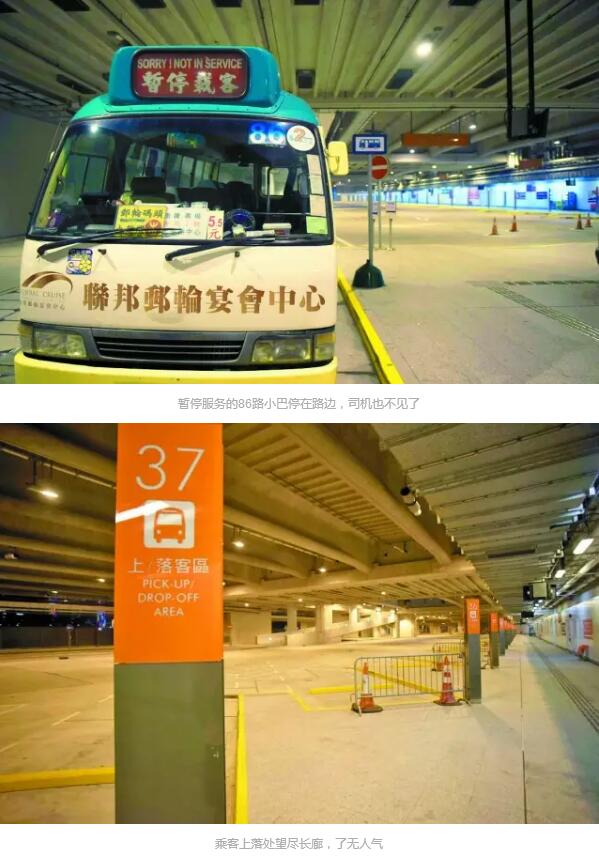 因为往来巴士班次太少,记者打的前往码头。地下的巴士站和的士站门可罗雀,宽阔的车道上只稀稀拉拉停着几辆小巴与巴士,不见路人,巴士的发车间隔都为30分钟。