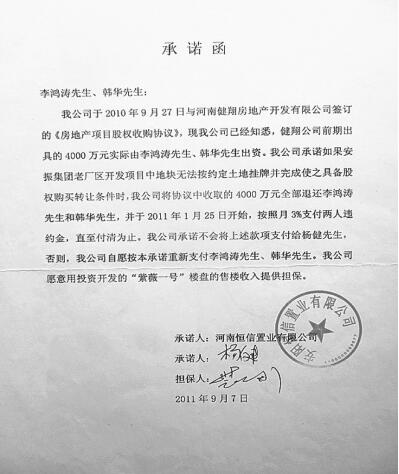 為了防范產生額外的經濟糾紛,2011年9月7日,韓華、李鴻濤兩人甚至還在楊健在場并簽字的情況下,讓裴志剛簽署了《承諾函》。
