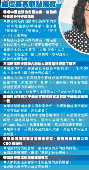 「改革開放永遠是機會,而不是風險。」他指,只要讀懂中國,投資有全球競爭力的行業領導企業,就能獲得長期投資回報。他分析指出四大長線投資趨勢是:科技和互聯網創新、自動化和人工智能、向清潔型經濟的轉變、老齡社會,都將在中國轉型中帶來新增長機會。他相信,未來30年,將有更多偉大的中國公司走向世界舞台,創造中國的「蘋果」、「耐克」、「微軟」等,它們也將出現在前10大市值的香港或中國海外上市公司中。