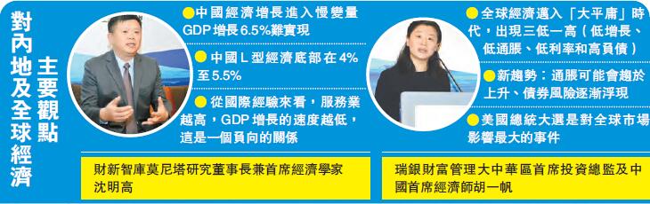另外,瑞銀財富管理大中華區首席投資總監及中國首席經濟師胡一帆分析,全球經濟邁入「大平庸」時代,出現三低一高(低增長、低通脹、低利率和高負債);並將出現兩種新趨勢:通脹可能會趨於上升、債券風險逐漸浮現。她認為,政治事件仍是不確定性和波動性的源頭,包括英國正式提交退歐申請、美國11月大選、德法明年大選等。目前,美國經濟、中國經濟的走勢是影響全球經濟最為關鍵的因素。她說,美國總統大選對全球市場影響最大的事件,並預計美聯儲12月加息的可能性較大,未來相當長的一段時間內國際油價會在40至50美元徘徊。