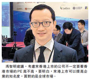 他建議,考慮來香港上市的公司不一定要看香港市場的PE高不高,要明白,來港上市可以提高企業的知名度,面對的是全球市場。