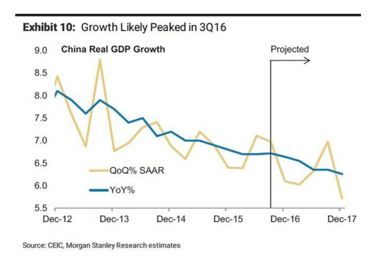 不過,摩根士丹利預計,在今年第三和第四季度分別增長6.7%和6.6%后,從明年起中國經濟擴張速度會放緩,可能季度增速會在明年第三季度達到巔峰。