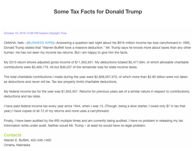 在周一的聲明中,巴菲特表示:“我13歲起就每年繳納聯邦所得稅了,雖然那年所繳稅金只有7美元。我有72份報稅單的副本,沒有任何一份用于結轉。”