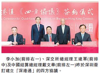 深港通《四方協議》昨日在深圳舉行簽約儀式。根據協議,深交所與聯交所以及中國結算與香港結算將分別平均分享因「深港通」產生的交易及結算費用,一如現時「滬港通」下各方分享收入的安排。聯交所及香港結算已經并將繼續在港交所網站刊發通告、資料文件及其他材料,為市場參與者及香港和海外投資者提供有關實施「深港通」的資料及指引。