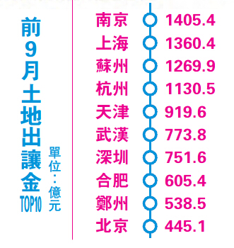 今年1-9月,全國300個城市土地供求總量回落,但地價呈普遍上漲態勢。據統計,1-9月全國300城共成交土地15585宗較去年減少7%,成交面積同比降2%;而在收金方面卻大幅增長,總額達19262億元同比大增40%;其中住宅用地出讓金總額15021億元,同比增加56%;僅前三季度的「賣地收入」就已超去年整年收金,全年有望再超4萬億元。