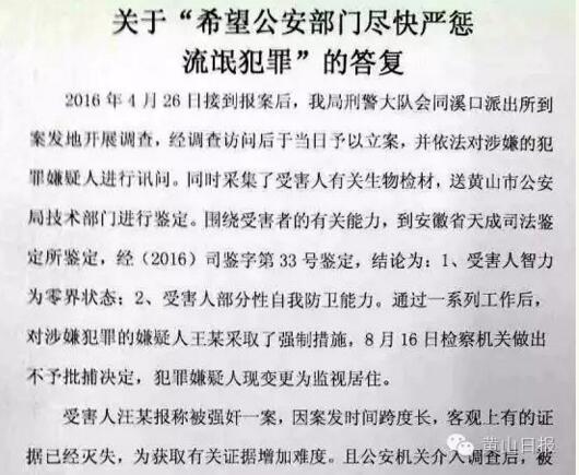 當天下午,休寧縣公安局就此回應,稱2016年4月26日接到報案后,休寧警方刑警大隊會同溪口派出所到案發地開展調查,經調查訪問后于當日就予以立案,并依法對涉嫌的犯罪嫌疑人進行訊問。同時采集了被害人有關生物檢材,送黃山市公安局技術部門進行鑒定。