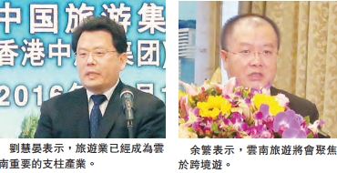 旅游業對雲南經濟貢獻一直頗大。雲南省副省長劉慧晏致辭時表示,2015年,雲南省接待海內外游客3.3億人,旅游總收入達3281.8億,旅游業已經成為雲南重要的支柱產業,以及具有無限發展潜力的特色優勢產業。他說,雲南是一片投資興業的沃土,希望有更多的香港企業到雲南投資開發旅游項目。
