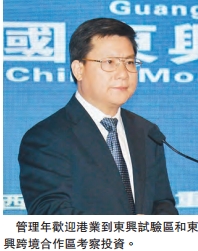 【香港商報網訊】記者吳愹玲報道:「廣西東興國家重點開發開放試驗區暨中國東興越南芒街跨境經濟合作區專場推介會」昨日假萬麗海景酒店舉行,廣西東興國家重點開發開放試驗區管委會常務副主任管理年、投資處處長農桂軍,世界華人協會會長程萬琦,利嘉事業(香港)控股有限公司副總裁劉德康,閩商資產管理有限公司董事長王詩增,億贊普集團顧問委員會高級顧問鄭躍進蒞臨出席,與香港加工貿易、電子商務、金融、物流、旅游等行業約40家企業代表歡聚一起,共商合作。