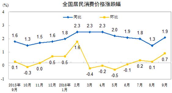 2016年9月份,全國居民消費價格總水平同比上漲1.9%。其中,城市上漲2.0%,農村上漲1.6%;食品價格上漲3.2%,非食品價格上漲1.6%;消費品價格上漲1.7%,服務價格上漲2.4%。