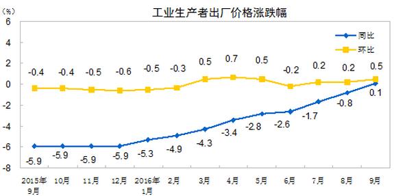 2016年9月份,全國工業生產者出廠價格環比上漲0.5%,同比上漲0.1%,同比是自2012年3月份以來首次由負轉正。工業生產者購進價格環比上漲0.4%,同比下降0.6%。1-9月平均,工業生產者出廠價格同比下降2.9%,工業生產者購進價格同比下降3.8%。