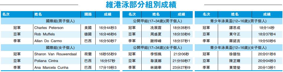 「维港渡海泳」国际组赛事中,美国长途游泳好手彼德臣,首次参与「维港渡海泳」便以16分44秒03夺男子组冠军;而女子组冠军,由里约奥运10公里游泳金牌得主荷兰泳手云露维尔胜出,时间为16分55秒09。而本地17至34岁公开组,由冼展霆以18分28秒50夺得男子组冠军,及李恒枫以21分07秒夺得女子组冠军。赛事中最年长泳手是74岁,而最年幼为12岁。