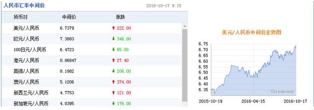 上周五,人民幣即期交易16:30收盤報6.7255,23:30收盤報6.7271。此前人民幣對美元中間價曾連續7天下調,但上周五回升,止住七連跌,不過本周一再度走弱。
