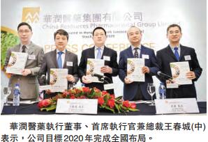 【香港商報网訊】記者莊海源報道:華潤醫藥集團(3320)今起至20日(周四)公開招股,計劃發行15.43億股,集資最多156.6億港元,招股價介乎8.45元至10.15元,每手500股,入場費約5126.14元,10月28日上市。華潤醫藥執行董事、首席執行官兼總裁王春城表示,公司為中國第二大醫藥製造商和分銷商,截至今年6月底止有超過6000間分銷商,未來會通過併購擴大在中國西北部、成都及陝西等地的分銷網絡,目標2020年完成全國布局。
