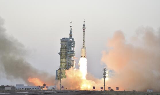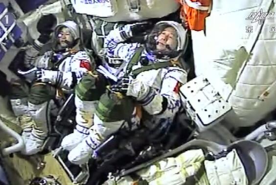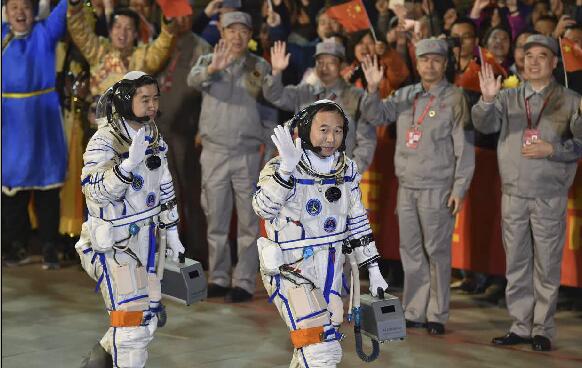 10月17日,神舟十一号航天员出征仪式在酒泉卫星发射中心举行。图为航天员景海鹏(右)、陈冬准备奔赴发射场。