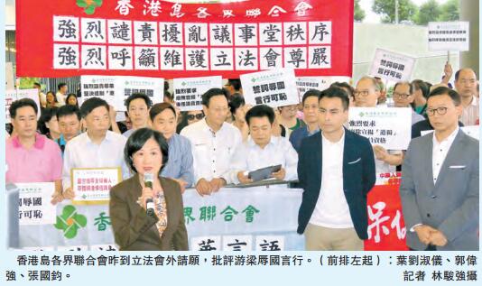 昨日,香港岛各界联合会逾百人到立法会外请愿,获民建联张国钧、新民党叶刘淑仪以及工联会郭伟强三位立法会议员声援。联合会要求梁、游道歉,也希望梁君彦依法行使主席权力,严正处理不合资格议员,端正议会风气。该会要求所有议员要抵制恶势力利用立法会「播独」,及维护香港法治和稳定,不负市民期望。